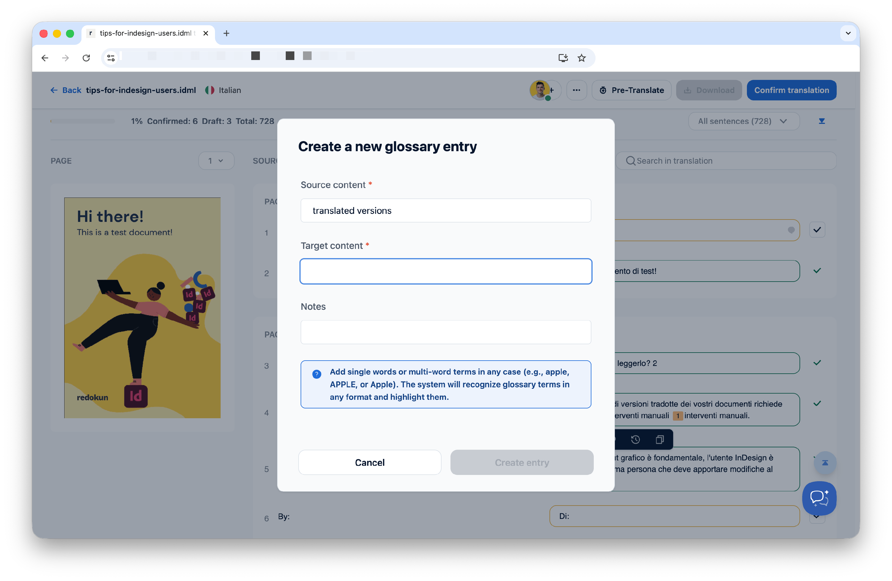 Your new term is immediately added to the Glossary and highlighted across all documents for that language pair.